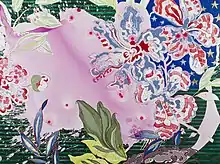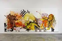 Reexamining her experience from a feminist perspective, she began drawing inspiration from suburban home decor.[19] She reconsidered her mother's “obsessive decorating” of her childhood home, an aesthetic that had at one time been only a symbol of her family's stifling conservatism, and transformed it into an important element of her work. She now uses vintage wallpaper patterns as a visual element in her work, and recounts asking her mother for leftover wallpaper and fabric samples to use in her studio. The plum blossom in particular is not only of central importance to Chinese art, it also appeared on the wallpaper of her childhood bedroom.[13]