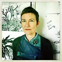 Elisabeth Condon was born in Los Angeles. She completed her BFA in Painting at Otis Art Institute of Parsons School of Design in 1986, as well as studying at UCSD for 1 year and UCLA for 2 years. She completed her MFA in Painting at the School of the Art Institute of Chicago in 1990 before moving to Brooklyn in 1992. She has taught extensively in Florida, and travelled widely for research and residencies. She curates exhibitions about topics that are relevant to her own practice, including paint pouring and contemporary reinterpretations of classical Asian painting.[24] Condon has also run an art criticism blog, Raggedy Ann's Foot, since 2007.[25]