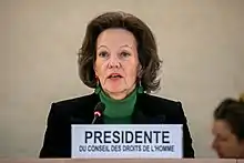 Tichy-Fisslberger was elected chair of the United Nations Human Rights Council in December 2019 to serve in 2020.[2] The Austrian Minister of Foreign Affairs, Alexander Schallenberg, noted that her appointment was a recognition of her country's human rights efforts. She was the first Austrian to hold this position in the United Nations.[3] She took over the position from Coly Seck of Senegal who had held the position in 2019.[4] Her vice-Presidents are Ambassadors Nasir Ahmad Andisha of Afghanistan, Togo's Yackoley Kokou Johnson, Mexico's Socorro Flores Liera and Slovakia's Juraj Podhorsky.[4]