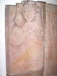 Elisabeth donated a valuable collection of 52 relics in two silver containers[5] to the collegiate church in Neustadt and der Haardt (now called Neustadt an der Weinstrasse). The relics were lost during the Reformation. Members of the House of Wittelsbach were buried in the choir of this church, and so was Elisabeth, who was a relative of the Wittelsbach family. Her damaged grave stone was found in 1907 in the church floor, near the northern entrance into the Catholic part of the church and is now part of the west wall of the south choir chapel.[6] The church has an "eternal" tradition of celebrating mass in Elisabeth's memory; a contemporary record in the Seelbuch mentions the donation in connection with this mass.