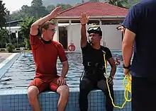 Established in 2013, the Naval Diving and Mine Warfare Headquarter (HqDMW) is a command for the RMN clearance diver, Explosive Ordnance Disposal (EOD) and salvage diver. The HqDMW is the Special Forces Equivalent Unit of RMN and its members are trained as frogmen (combat diver).[27] This command is the successor of the RMN Naval Diving Unit (EST. 1965).[28] On 15 September 1998, Naval Diving Unit merged with the Navy Diving School and formed as KD Duyong (internationally known as Royal Malaysian Navy Mine Warfare and Diving Centre).[29][30] In 2013, the unit was separated from Duyong and made into one command. Duyong continues to serve as a diving school and training centre.[31][32] HqDMW is based at Lumut RMN Naval Base and consist of teams with speciality such as: