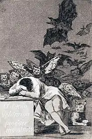 - Curator Heather Campbell Coyle compared it to Michelangelo's The Dream (c.1533) and Francisco Goya's Capricho 43: The Sleep of Reason Produces Monsters (1799). In Sparhawk-Jones' painting, the dreamer is a sleeping nude woman surrounded by images that seem to reflect her eerie nightmare.[47] A skeleton lies against a stone in the foreground and above her nude women are carried by "winged creatures" into the darkness.[47] Women are also carried away by men with wings, dressed in business suits.[47] The painting has a composition similar to Michelangelo's painting, but Coyle states that, to her, the work is more similar to Goya's painting that also includes winged creatures above the sleeping subject of the painting.[47]