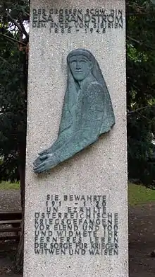 A ceremony at Arne-Karlsson-Park in Vienna on 16 September 1965 preceded the official opening of the XXth International Conference of the Red Cross. In the presence of Austrian civilian and military authorities, members of the Swedish colony, leaders of the Austrian Red Cross and many conference delegates, a monument to Elsa Brändström was unveiled. This monument, by the sculptor Robert Ullmann, stands as a testimony of gratitude to the famous Swedish nurse's work for German-Austrian prisoners during the First World War.[14]