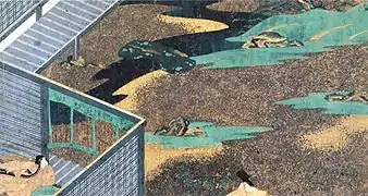 However, the stylistic mastery of later works (from the 12th century) leads most experts to believe that the "classical" art of emakimono grew during this period from the 10th century, first appearing in illustrations in novels or diaries produced by the ladies of the court.[26] In addition, the initial themes remained close to waka poetry (seasons, Buddhism, nature and other themes).[27] Therefore, the slow maturation of the movement of emakimono was closely linked to the emergence of Japanese culture and literature, as well as to the interest of courtesans soon joined by professional painters from palace workshops (e-dokoro) or temples, who created a more "professional" and successful technique.[21] The art historians consider that the composition and painting techniques they see in the masterpieces of the late Heian period (second half of the 12th century) were already very mature.[28]