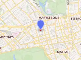 In the 1910s, the chancery building was located at 73 Portland Place.[2] In 1922, the legation had moved to 27 Portland Place.[3] In the early 1950s, it moved to 29 Portland Place.[4] In the late 1960s, it moved once again, this time to 23 North Row in Mayfair.[5] Since 1983, the chancery building is located at 11 Montagu Square in Marylebone, just down the road from the embassy of Switzerland.