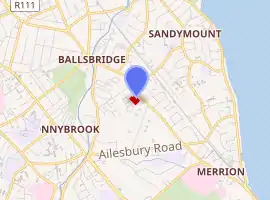 The Embassy of the United Kingdom in Dublin is the chief diplomatic mission of the United Kingdom of Great Britain and Northern Ireland in Ireland. The Embassy is located on Merrion Road in the Ballsbridge area of the city. The current British Ambassador to Ireland is Paul Johnston.[1]