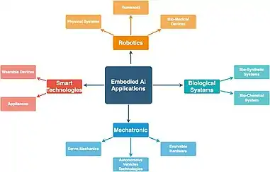Traditional artificial intelligence involves a computational approach. This primary computational paradigm evolved to the embodied perspective with embodied cognition studies and brought more interdisciplinary research topics to artificial intelligence. Embodied perspective brings a necessity of working with the physical world and systems which came alongside robotics. Robotics are essential for the embodied artificial perspective because computers and robots are different, according to Iida et al.(2004), while computers define the inputs, robots can interact with the physical world via their own body.[60] Researchers working on embodied AI is moving away from an algorithm-driven approach to the robots to interact with the physical world.[61] Embodied Artificial intelligence tries to figure out how biological systems work first, then construct basic rules of intelligent behavior, and finally apply that knowledge to create artificial systems, robots, or intelligent devices.[62] Embodied artificial intelligence has a large scale of applications and research. For instance, we see the embodied artificial approach in micro-and nano-mechatronic systems and evolvable hardware, top-down bio-synthetic systems research, bottom-up chemo-synthetic systems, and biochemical systems.[63] The majority of embodied artificial intelligence focuses on robot training and autonomous vehicles technologies. Autonomous vehicles have a significant interest in embodied artificial intelligence applications because this technology allows driving and making possible judgments based on what they see as humans do.[64]