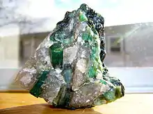 Emerald is a gemstone and a variety of the mineral beryl (Be3Al2(SiO3)6) colored green by trace amounts of chromium or sometimes vanadium.[2] Beryl has a hardness of 7.5–8 on the Mohs scale.[2] Most emeralds are highly included,[3] so their toughness (resistance to breakage) is classified as generally poor. Emerald is a cyclosilicate.