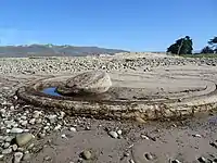 The Wood property and the adjoining Seaside Wilderness Park (owned by the City of Ventura) include multiple ecosystems, including sand dunes, a flood plain, cobblestone beach, riparian woodland, and wetlands.[10] At the eastern edge of the beach, the Ventura River estuary attracts a variety of wildlife, including great blue herons.[9] A total of 300 plant species and 233 species of birds have been identified in the area.[10] The Ocean's Edge Trail runs through both the Wood and Seaside properties.[10] Dolphins are also sometimes seen off the coast from the beach; the Los Angeles Times in 1997 wrote that Emma Wood is the "best bet" for dolphin watching.[11]
