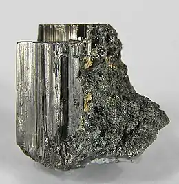 Enargite is a copper arsenic sulfosalt mineral with formula Cu3AsS4. It takes its name from the Greek word enarge, "distinct". Enargite is a steel gray, blackish gray, to violet black mineral with metallic luster. It forms slender orthorhombic prisms as well as massive aggregates. It has a hardness of 3 and a specific gravity of 4.45.