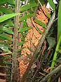 The leaves, arranged in a crown at the apex of the stem, supported by a tomentose petiole 1–7 cm long, are 200–300 cm long and are composed of numerous lanceolate leaflets, 20–26 cm long, 28–36 mm wide, arranged on the spine at 45-80°; the basal leaflets are reduced to thorns.