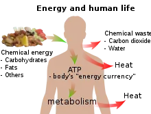 The rest of the chemical energy of O2[9] and the carbohydrate or fat are converted into heat: the ATP is used as a sort of "energy currency", and some of the chemical energy it contains is used for other metabolism when ATP reacts with OH groups and eventually splits into ADP and phosphate (at each stage of a metabolic pathway, some chemical energy is converted into heat). Only a tiny fraction of the original chemical energy is used for work:[note 1]