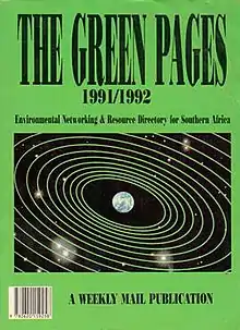 - 1991: First National Conference on Environment and Development; Environmental Monitoring Group releases a document "Towards Sustainable Development in South Africa";[3] General Magnus Malan takes over as new Minister of Water Affairs and Forestry; Bev Geach of the Weekly Mail publishes The Green Pages, a directory of environmental groups