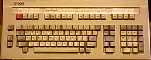 The Epson QX-10 is a microcomputer running CP/M or TPM-III (CP/M-80 compatible) which was introduced in 1983. It was based on a Zilog Z80 microprocessor, running at 4 MHz, provided up to 256 KB of RAM organized in four switchable banks, and included a separate graphics processor chip (µPD7220) manufactured by NEC to provide advanced graphics capabilities. In the USA and Canada, two versions were launched; a basic CP/M configuration with 64 KB RAM and the HASCI configuration with 256 KB RAM and the special HASCI keyboard to be used with the bundled application suite, called Valdocs. TPM-III was used for Valdocs and some copy protected programs like Logo Professor. The European and Japanese versions were CP/M configurations with 256 KB RAM and a graphical Basic interpreter.