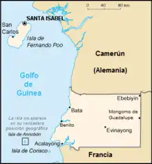 Spain had not occupied the large area in the Bight of Biafra to which it had right by treaty, and the French had busily expanded their occupation at the expense of the territory claimed by Spain. Madrid only partly backed the explorations of men like Manuel Iradier who had signed treaties in the interior as far as Gabon and Cameroon, leaving much of the land out of 'effective occupation' as demanded by the terms of the 1885 Berlin Conference. More important events such as the conflict in Cuba and the eventual Spanish–American War kept Madrid busy at an inopportune moment. Minimal government backing for mainland annexation came as a result of public opinion and a need for labour on Fernando Pó.[38]