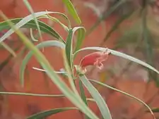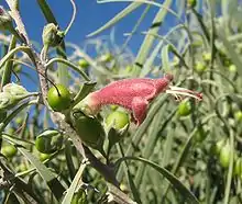 The flowers are borne in groups of up to 5 in leaf axils on stalks mostly 4–8 mm (0.2–0.3 in) long. There are 5 green, egg-shaped, tapering, hairy sepals which are mostly 2–7 mm (0.08–0.3 in) long. The petals are mostly 20–30 mm (0.8–1 in) long and are joined at their lower end to form a tube. The petal tube is brick-red to pink, sometimes spotted inside with darker red. The inside and outside of the tube are covered with hairs, more densely so on the outside. The 4 stamens extend beyond the end of the petal tube. Flowering occurs at different times in different parts of the country. In Western Australia it mainly occurs between March and November, in southern Queensland during spring and summer but in the Riverina area of New South Wales there is no distinct flowering season. In most places, flowers may appear in any season, depending on rainfall.[6] The fruits which follow are oval to almost spherical in shape, 5–12 mm (0.2–0.5 in) long and are yellow at first, then turn brown and finally black.[2][3][4][5]