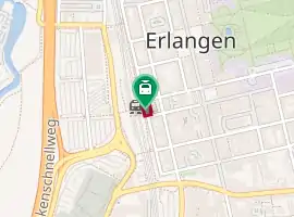 East of the station is the Hauptbahnhof bus stop, formerly called Bahnhofsplatz,[5] which is served by city bus routes 281, 283–289 and 293–295 operated by Erlanger Stadtwerke (the city utility), by routes 20, 30 and 30E operated by Verkehrs-Aktiengesellschaft Nürnberg (VAG, the Nuremberg municipal public transport company), and by regional bus routes 202, 203, 205 and 253 operated by Omnibusverkehr Franken (OVF, a regional bus company, based in Nuremberg and owned by Deutsche Bahn). The bus station to the west of the station is served by regional bus routes 201, 208–210 and 254 operated by OVF.[6]
