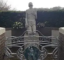 When the war ended De Jonge's older brother Marien returned to the Netherlands and was reunited with his wife and son. Nine months later they had a second son, which they named Ernst in memory of Marien's younger brother.[10] When Marien reached 100 years of age a celebration was held for him, and though happy to be with all his family, he asked ‘Waarom word ik honderd en is mijn broer zo vroeg gestorven?’("Why did I live to be a hundred and my brother died so young?") His family started a fund to raise money for a memorial to his brother. On March 9, 2012, a casting of De Jonge was placed in the Minerva Society at Leiden.[4] Marien de Jonge spoke of his brother at the unveiling ceremony.[11]