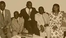 As a trade unionist, a legal advocate and scholar, he was one of the key members of the original trade-union movement in Kenya which advocated for fair wages, suitable employment conditions, and housing for African workers.[36] During the Kakamega Gold Rush of 1930–52[16] he advocated for the unionisation of African mine workers as a non-violent effective approach to fight for their rights through collective bargaining initiatives; he implored the Local Native Council (LNC) of North Nyanza[Note 6] to support the unionisation approach, but was unsuccessful.[6][37][38] Nevertheless, he endeavoured to bring attention and awareness of sympathetic Britons to the plight of the native Africans.[39] Colonial authorities deemed his actions to be sedition or rabblerousing and were posthaste outlawed.[40]