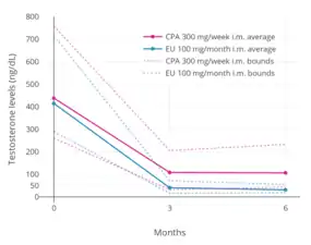 An expanded report of 191 patients, which included the 42 patients from the University of Mainz center plus an additional 149 patients from 11 other centers, was published in 1982.[41][47] The antitumor effectiveness of estradiol undecylate and cyproterone acetate in this study was equivalent.[41][43][55][44][25][45] The rates of improvement, no response, and deterioration were 52%, 41%, and 7% in the estradiol undecylate group and 48%, 44%, and 8% in the cyproterone acetate group, respectively.[41][44] However, the incidence of a selection of specific side effects, including gynecomastia, breast tenderness, and edema, was significantly lower in the cyproterone acetate group than in the estradiol undecylate group (37% vs. 94%, respectively).[41][43][44][56] Gynecomastia specifically occurred in 13% (12/96) of the patients in the cyproterone acetate group and 77% (73/95) of the patients in the estradiol undecylate group.[41][43] Erectile dysfunction occurred in "essentially all" patients in both groups.[47] Leg edema occurred in 18% (17/95) of the estradiol undecylate group and 4.2% (4/96) of the cyproterone acetate group, while the incidences of superficial thrombophlebitis and coronary heart disease both were not described.[41] The incidence of thrombosis was 4.2% (4/95) in the estradiol undecylate group and 5.3% (5/96) in the cyproterone acetate group.[41][46][47] There were five deaths in total, three in the estradiol undecylate group and two in the cyproterone acetate group.[41] Two of the deaths in each of the treatment groups were due to cardiovascular events, while the remaining death in the estradiol undecylate group was due to unknown causes.[41][44][47] The similar rate of cardiovascular complications besides edema between estradiol undecylate and cyproterone acetate that was observed is in contrast to the initial 42-patient report and to findings with other estrogens, such as diethylstilbestrol and estramustine phosphate, which have been shown to possess significantly higher cardiovascular toxicity than cyproterone acetate.[43] On the basis of the expanded study, the researchers concluded that cyproterone acetate was an "acceptable alternative" to estrogen therapy with estradiol undecylate, but with a "considerably more favorable" side-effect profile.[44]