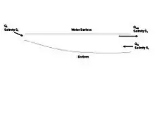 Inverse estuaries occur in dry climates where evaporation greatly exceeds the inflow of freshwater. A salinity maximum zone is formed, and both riverine and oceanic water flow close to the surface towards this zone.[7] This water is pushed downward and spreads along the bottom in both the seaward and landward direction. The maximum salinity can reach extremely high values and the residence time can be several months. In these systems, the salinity maximum zone acts like a plug, inhibiting the mixing of estuarine and oceanic waters so that freshwater does not reach the ocean. The high salinity water sinks seaward and exits the estuary.[8][9]