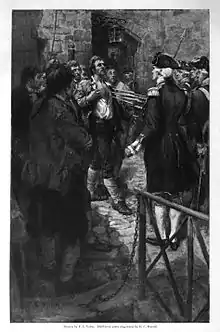 Allen was first placed aboard HMS Gaspée, a brig anchored at Montreal. He was kept in solitary confinement and chains, and General Richard Prescott had, according to Allen, ordered him to be treated "with much severity".[83] In October 1775, Gaspée went downriver, and her prisoners were transferred to the merchant vessel Adamant, which then sailed for England.[84][lower-alpha 2] Allen wrote of the voyage that he "was put under the power of an English Merchant from London, whose name was Brook Watson: a man of malicious and cruel disposition".[85]