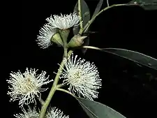 Eucalyptus baeuerlenii, commonly known as Baeuerlen's gum,[3] is a mallee, sometimes a tree, that is endemic to New South Wales. It has smooth bark throughout, lance-shaped to curved adult leaves, oblong to spindle-shaped buds in groups of three in leaf axils, white flowers and bell-shaped, cup-shaped or conical fruit. It grows in mountain areas in the south of the state.