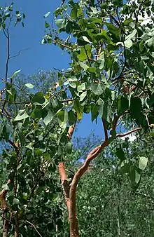 Eucalyptus bigalerita, commonly known as the northern salmon gum,[3] Adelaide River white gum,[4] or poplar gum[5] is a species of tree that is endemic to north-western Australia. It has smooth bark, large triangular to more or less round adult leaves, flower buds in groups of seven, white flowers and conical to hemispherical fruit.