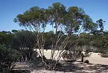 White mallee is found on sandplains on the south western Goldfields-Esperance , Wheatbelt and Great Southern regions of Western Australia growing in mallee shrubland in sandy or clay sand soils with lateritic gravel.[2][4]