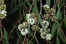 Eucalyptus elata is a tree that typically grows to a height of 40 m (130 ft), rarely a mallee to 6 m (20 ft), and forms a lignotuber. It has rough, compact, dark grey bark, with narrow longitudinal fissures on the lower trunk. The bark on the upper trunk and branches is smooth, shedding in long ribbons often remaining in the crown, leaving a grey, cream-coloured or whitish surface. Young plants and coppice regrowth have leaves arranged in opposite pairs, lance-shaped to curved, 33–105 mm (1.3–4.1 in) long and 6–16 mm (0.24–0.63 in) wide. Adult leaves are arranged alternately, the same glossy green on both sides, lance-shaped to curved, 60–220 mm (2.4–8.7 in) long and 6–20 mm (0.24–0.79 in) wide on a petiole 6–20 mm (0.24–0.79 in) long. The flower buds are arranged in groups of between eleven and thirty or more in leaf axils on an unbranched peduncle 4–12 mm (0.16–0.47 in) long, the individual buds on a pedicel 3–5 mm (0.12–0.20 in) long. Mature buds are club-shaped, 2–4 mm (0.079–0.157 in) long and 1.5–3 mm (0.059–0.118 in) wide with a conical to rounded operculum. Flowering occurs from August to December and the flowers are white. The fruit is a woody, hemispherical or shortened spherical capsule 3–5 mm (0.12–0.20 in) long and 3–6 mm (0.12–0.24 in) wide with the valves enclosed below the rim.[2][3][4][5]