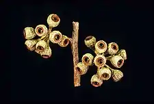 Eucalyptus elata, commonly known as the river peppermint or river white gum,[2] is a species of medium to tall tree that is endemic to eastern Australia. It has rough, compacted bark on the lower trunk, smooth bark above, lance-shaped to curved adult leaves, green to yellow flower buds arranged in groups of eleven to thirty or more, white flowers and hemispherical or shortened spherical fruit.