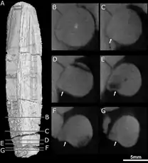 CT scanning shows that these openings lead to canals that connect to the trigeminal nerve, which controls facial sensitivity. The forward-directed canal also splits into the three main branches of the infraorbital nerve,[11] all of which connect to the socket of the canine; the junction occurs about 3–6 millimetres (0.12–0.24 in) along the canal, another point of variation between the two skulls. The top branch, the external nasal ramus, splits into four branches in the type skull, but it does not split in the second skull. In other therapsids like Thrinaxodon, Bauria, and Olivierosuchus, the external nasal ramus generally splits into three or more branches. All of these canals would have brought nerves and nutrient-rich tissue to the root of the canines and the rest of the upper jaw.[2][11]