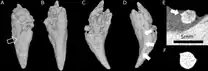The type specimen preserves the right canine.[2] Like other therocephalians, the canine of Euchambersia was very large, resulting in a specialized predatory lifestyle that incorporates a sabertooth bite into prey killing.[6] It is round in cross-section,[3] and bears a prominent ridge on the side of its front surface. Immediately beside this ridge is a shallow depression that becomes wider near the top of the tooth, which is probably the same structure as the groove interpreted by some authors.[2][7] Theriodonts usually replace their teeth in an alternating[8] (or distichial) pattern,[9][10] such that the canine tooth is always functional; both skulls of Euchambersia show no sign of any replacement canines developing, suggesting that Euchambersia was reliant on having both canines present and functional simultaneously.[2]