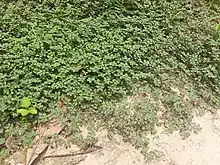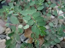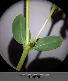 Euphorbia prostrata is an annual herb producing slender prostrate stems up to approximately 20 centimetres (7.9 in) long, sometimes purple-tinted in color.[1] The oval-shaped leaves are up to one centimetre (0.39 in) long with finely toothed edges.