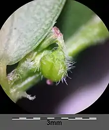 The inflorescence is a cyathium less than two millimetres (0.079 in) wide, with white petal-like appendages surrounding the actual flowers. There are four male flowers and a single female flower, the latter developing into a lobed, hairy fruit one to two millimetres (0.039 to 0.079 in) wide.