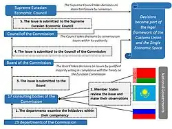 The Eurasian Economic Union has an integrated single market of 184 million people and a gross domestic product of over Int$5 trillion.[9] The EAEU encourages the free movement of goods and services, and provides for common policies in the macroeconomic sphere, transport, industry and agriculture, energy, foreign trade and investment, customs, technical regulation, competition, and antitrust regulation. Provisions for a single currency and greater integration are envisioned for the future.[10][11][12] The union operates through supranational and intergovernmental institutions. The Supreme Eurasian Economic Council is the supreme body of the Union, consisting of the Heads of the Member States. The second level of intergovernmental institutions is represented by the Eurasian Intergovernmental Council (consisting of the Heads of the governments of member states). The day-to-day work of the EAEU is done through the Eurasian Economic Commission, the executive body of the Union. There is also a judicial body – the Court of the EAEU.[13]