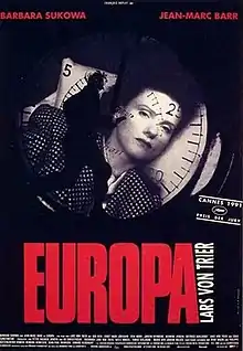 Europa (known as Zentropa in North America) is a 1991 political drama art film directed by Lars von Trier. It is von Trier's third theatrical feature film and the final film in his Europa trilogy following The Element of Crime (1984) and Epidemic (1987).[5]