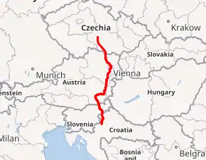 Route of the E59 starts in Prague, Czech Republic, and proceeds southeast along the D1 motorway towards Jihlava, where it leaves the motorway and turns south along the route 38, a regular road comprising at-grade intersections. The route passes near Moravské Budějovice and Znojmo.[1] It crosses from the Czech Republic to Austria between Chvalovice and Haugsdorf as it switches to Austrian B303 state road, representing another two-lane road with at-grade intersections. North of Guntersdorf, the E59 transfers to the S3 expressway until it reaches Stockerau and the A22 which carries the E59 east to Vienna. Within the city, the E59 turns south once again in Donaustadt, transferring to the A23 taking it to the southern outskirts of the city. There it proceeds further south along the A2 motorway taking the route past Wiener Neustadt to the city of Graz. Graz itself is bypassed by the motorway and the E59 switches there to the A9 motorway marking the final southbound leg of the E59 through Austria until it reaches Spielfeld/Šentilj border crossing to Slovenia.[2] South of the border crossing the E59 route follows the Slovenian A1 motorway to the south of Maribor where the E59 leaves the A1 route and joins the A4 taking it to Gruškovje/Macelj border crossing to Croatia.[3] South of the border, the E59 follows Croatian A2 motorway running past Krapina to Zagreb. The E59 terminates at Jankomir interchange of the Zagreb bypass, where southbound E59 traffic defaults to the eastbound A3 motorway.[4] Originally the E59 extended further south past Zagreb, to Bihać, Bosnia and Herzegovina and Split at the Adriatic Sea coast, however, that segment of the route was subsequently transferred to the European route E71. Nonetheless, the E59 shares segments of the route with a number of other European routes.[5] A part of the E59 spanning Prague and Vienna corresponds to the Pan-European Corridor IV, and the segment spanning Graz and Zagreb corresponds to the Pan-European Corridor Xa.[6]