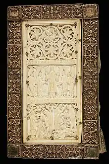 The crucial element of the Evangelium longum’s cover are the two ivory plaques that were carved by Tuotilo. Now as then, their size is considered extraordinary. Ekkehard writes that the plaques are of a dimension, "as if the elephant furnished with such teeth had been a giant compared to his conspecifics".[8] Pieces of bone were used in order to mend holes in the ivory.[9]