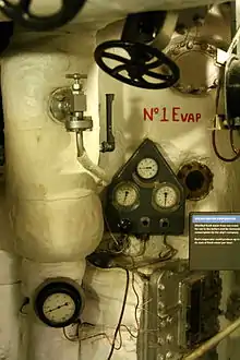Vapour-compression distillers were installed on US submarines shortly before World War 2.[34] Early attempts had been made with evaporators running from diesel engine exhaust heat, but these could only be used when the submarine was running at speed on the surface. A further difficulty with submarines was the need to produce high-quality water for topping up their large storage batteries. Typical consumption on a war patrol was around 500 US gallons (1,900 litres) per day for hotel services, drinking, cooking, washing[lower-roman 2] etc. and also for replenishing the diesel engine cooling system. A further 500 gallons per week was required for the batteries.[34] The standard Badger model X-1 for diesel submarines could produce 1,000 gallons per day. Tank capacity of 5,600 gallons (1,200 of which was battery water) was provided, around 10 days reserve.[34] With the appearance of nuclear submarines and their plentiful electricity supply, even larger plants could be installed. The X-1 plant was designed so that it could be operated when snorkelling, or even when completely submerged. As the ambient pressure increased when submerged, and thus the boiling point, additional heat was required in these submarine distillers, and so they were designed to run with electric heat continuously.[34]