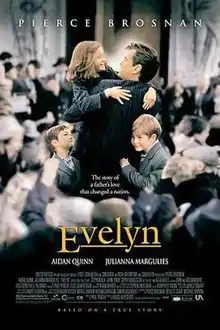 Evelyn is a 2002 Irish drama film, loosely based on the true story of Desmond Doyle and his fight in the Irish courts (December 1955) to be reunited with his children. The film stars Sophie Vavasseur in the title role, Pierce Brosnan as her father and Aidan Quinn, Julianna Margulies, Stephen Rea, and Alan Bates as supporters to Doyle's case. The film had a limited release in the United States, starting on December 13, 2002 and was later followed by the United Kingdom release on March 21, 2003.