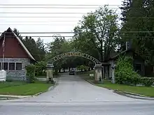 Evergreen Cemetery was constructed on a 45 acre site, and has been expanded by purchase and donation.[5] Its entrance is located at 465 West Street in Rutland Town, near the border with Rutland City, and across the street from the Rutland Town Hall.[2] designed in the rural cemetery tradition, the location was originally a pine forest and retains many aspects of a wood or grove.[3] It is enclosed by walls of varying heights, many of which are made of local marble, and numerous vines and flowering shrubs enhance the cemetery's appearance.[3] Winding paths and roads traverse the location as they climb a series of knolls.[3]