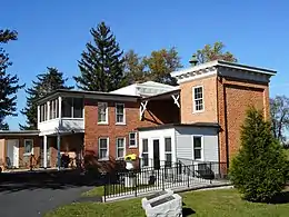 Philadelphia architect Stephen Decatur Button designed the cemetery's gatehouse in mid-1855,[2] and its cornerstone was laid by Reverend Samuel Simon Schmucker on September 1.[3] Local masons George and Henry Chritzman constructed the brick building in less than 3 months,[2] at a cost of $1,025.[2] The gatehouse served as the cemetery's office, and as the residence of its caretaker.[4]