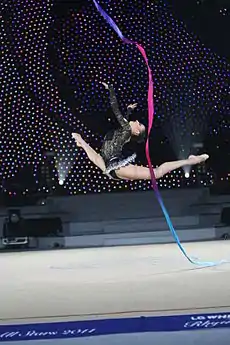At the 2009 World Championship in Mie, Japan, Kanaeva became the first rhythmic gymnast to win all six titles.[9] She repeated the feat at the 2011 World Championship in Montpellier, France, equaling her own record.[10]