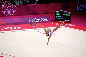 Evgeniya Olegovna Kanaeva OMF (Russian: Евгения Олеговна Канаева; born 2 April 1990) is a Russian individual rhythmic gymnast. She is the only individual rhythmic gymnast in history to win two Olympic all-around gold medals, winning at the 2008 Summer Olympics, where she finished with 3.75 points ahead of silver medalist Inna Zhukova, and at the 2012 Summer Olympics, where she also became the oldest gymnast to win the Olympic gold.[7] On 4 July 2013, Kanaeva received the International Fair Play Award for "Sport and Life".[8]