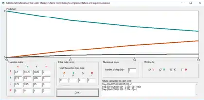 In this example, predictions for the weather on more distant days change less and less on each subsequent day and tend towards a steady state vector.[4] This vector represents the probabilities of sunny and rainy weather on all days, and is independent of the initial weather.[4]