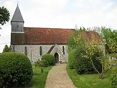 The parish contains numerous archaeological sites including a Mesolithic flint working site, Bronze Age bowl barrows and the Iron Age fort at Old Winchester Hill. There are also Roman and Dark Age sites and the site of the mediaeval village of Lomer. The 13th-century church of St Peter and St Paul was heavily restored in the 19th century.[5] The 1892 restoration (the second of the 19th century) added stained glass windows by Charles Spooner in the style of the Arts and Crafts movement.[6]
