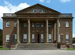 The second Grade I listing includes Berrington Hall and its laundry, dairy and stable outbuildings surrounding the north-east courtyard. The hall is a neoclassical English country house dating to 1778 - 1781, designed by Henry Holland for Thomas Harley, a banker and Lord Mayor of London who had bought the Berrington estate in 1775. The building is of pink sandstone ashlar construction with a portico supported by Ionic columns. The present parkland was laid out by Capability Brown, which includes the 14 acres (5.7 ha) Berrington Pool lake and island. Berrington hall, listed in 1959, is a National Trust property.[37][38][39]