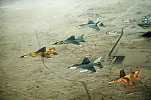 Coalition forces shot down several Iraqi F1s during the Gulf War, such as six F1EQs that were shot down by USAF F-15 Eagles. A pair of F1EQs, which were preparing to carry out an attack on Saudi oil facilities were shot down by a Royal Saudi Air Force (RSAF) F-15C.[63][64] Of a pre-conflict force of 88 Mirage F1EQs, 23 were destroyed in the war, a further six were damaged, 24 were flown to Iran and interned; only 23 aircraft remained in service by the end of the Gulf War.[1] Of the 23 destroyed Iraqi Mirage F1EQs, 9 were claimed to have been destroyed in aerial combat.[49]