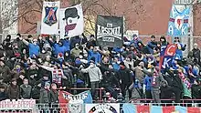 Due to predominant right-wing football supporters in Ukraine, the Arsenal supporters "Mad Rebels" lean strongly towards the anti-fascist movement and in the majority perceived as left-wing supporters.[61] Colors of the Arsenal fans coincide with those of the Ukrainian Soviet Socialist Republic's flag, while the Kyiv Arsenal factory is associated with pro-Bolshevik sentiment during the Kiev Arsenal January Uprising in 1918 following which Kyiv was overrun by the armed forces of Soviet Russia. The Arsenal supporters could also be associated with Partizan Minsk who have similar political beliefs.[61] The 2012 documentary by BBC manipulated with public opinion about the real atmosphere of football supporters in Ukraine.[61]